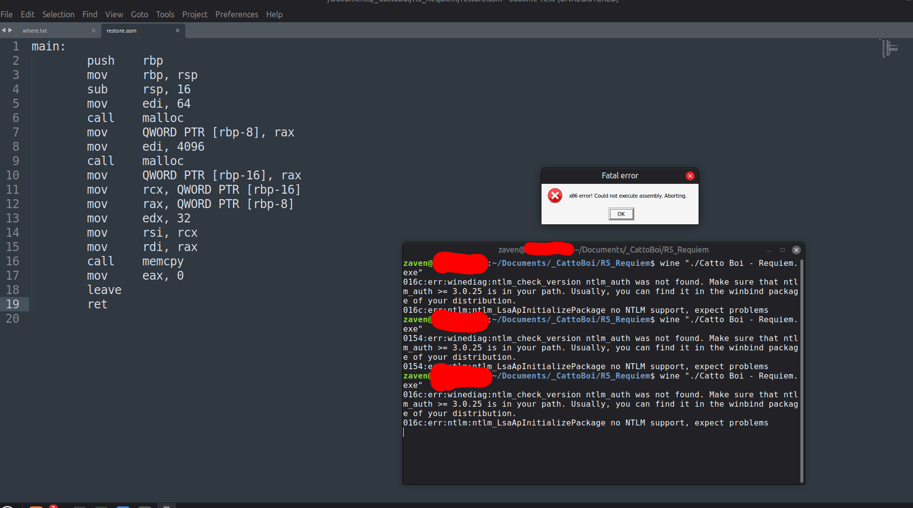 EDIT: The "restore.asm" section isn't working for some reason, it gives an "x86 error" message and closes. I'm not sure if this is an issue with Sublime Text saving the file with the wrong encoding, or if the game just isn't good at reading files on WINE (note: the file is in the same directory as the executable, and a similar segment in frozen tuna with "restore/game.win" worked just fine for me)